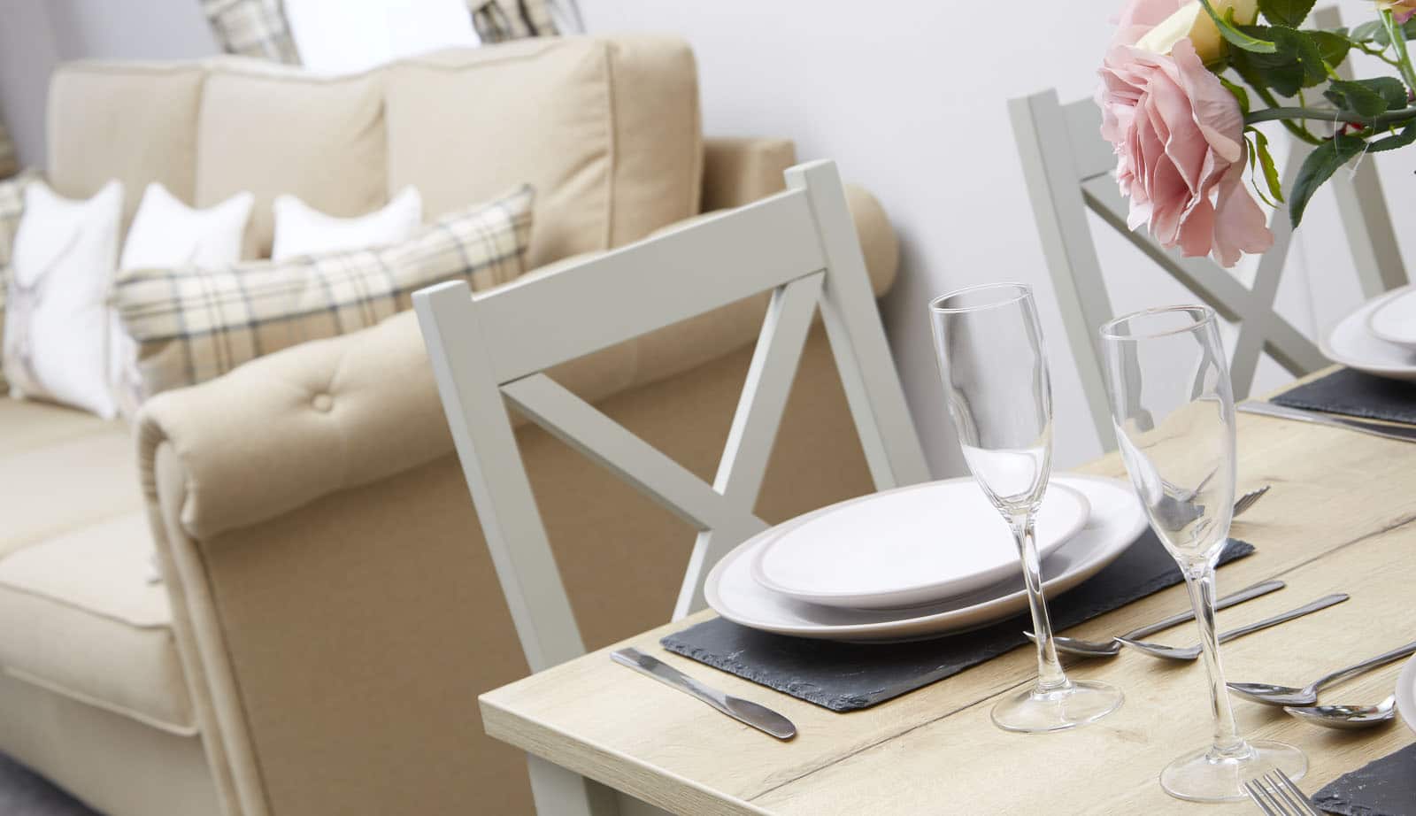 Imagine throwing a party in that insta-worthy kitchen! With a wealth of warm welcoming spaces, the 40 x 13ft Ambleside is a stunning setting to get together and create memories. The kitchen in the picture boasts a stone-look splashback, flag-effect floor, a large pantry for all your bits and bobs, and not a four, but a five-burner hob as well as a proper dining room table and upholstered chairs.